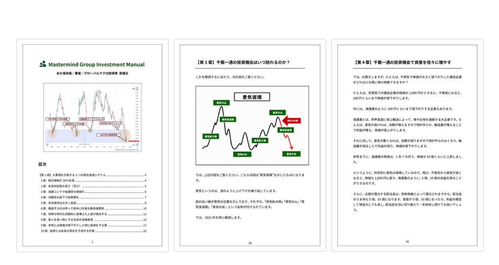 幾度の千載一遇の投資機会で、一生お金に困らないほどの収益を得続けている【千載一遇の投資マニュアル】です。投資の指南書(投資の手引書)として、ぜひ、ご愛用いただければと思います。(高橋 正)